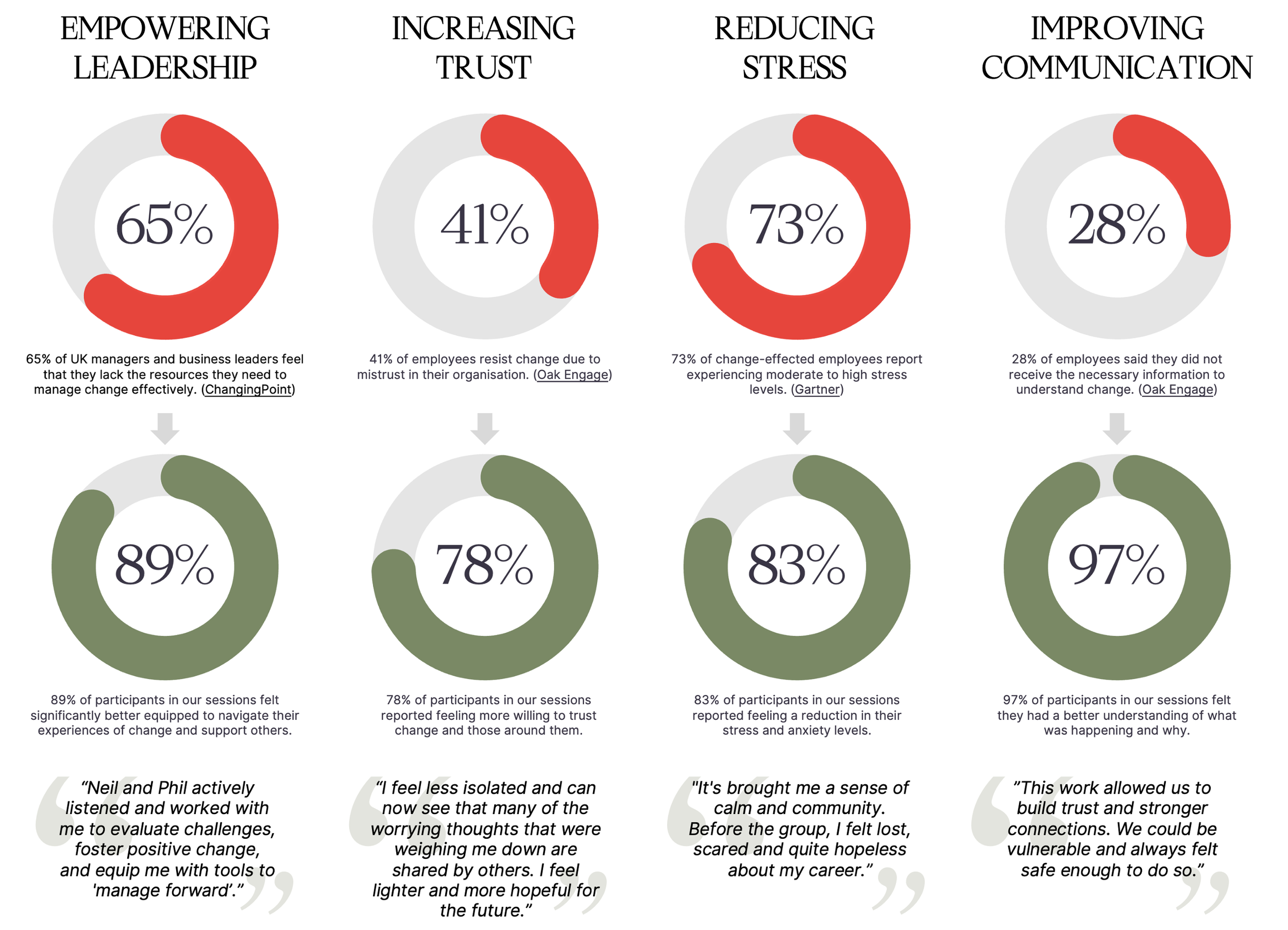 Through our focused, energising sessions, we surface the deeper why behind resistance and reframe change as an ongoing human process, not a one-off initiative. Clients leave with fresh perspectives and practical tools they can use immediately - building more open, resilient and change-ready cultures that endure long after our work together ends.
